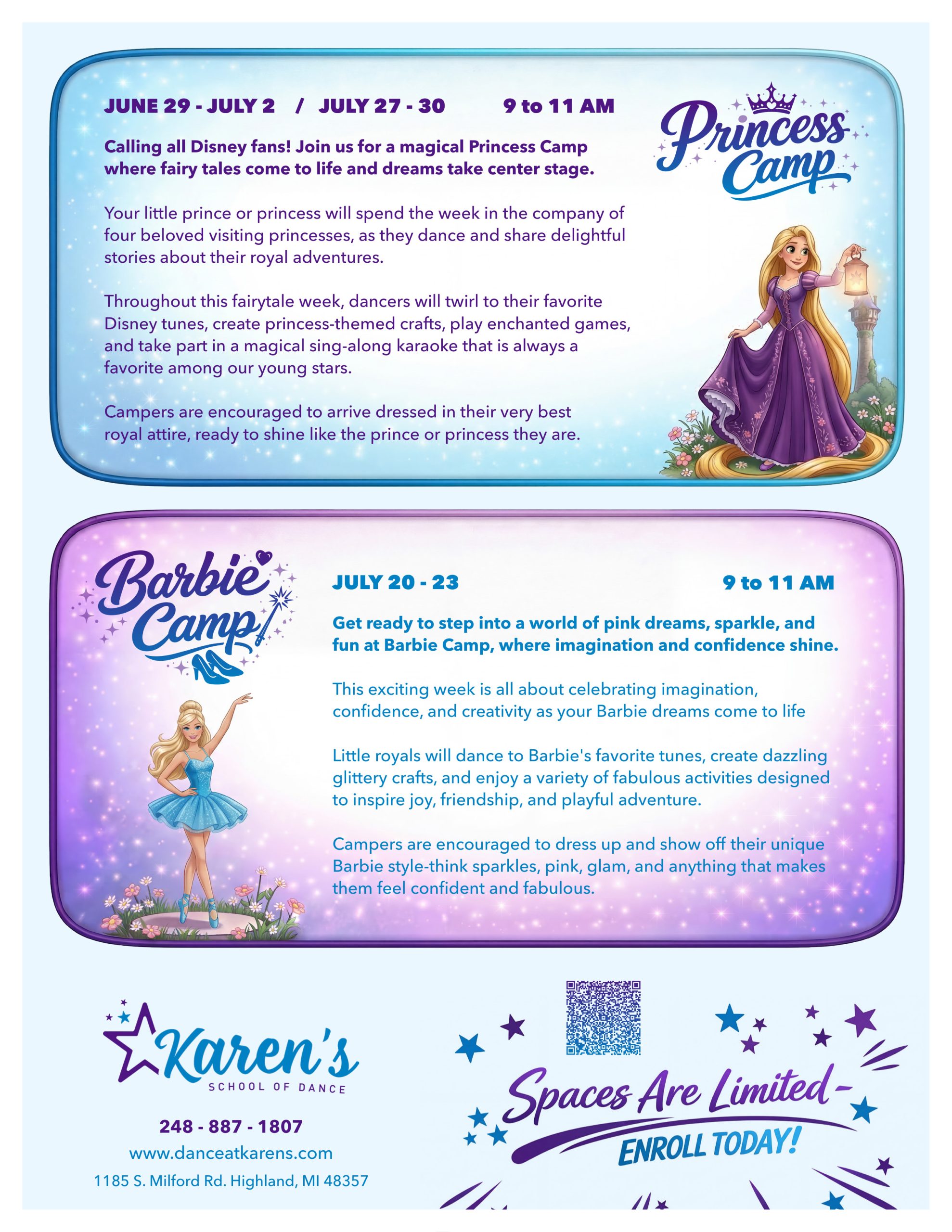 Calling all Disney fans! Your little Princess/Prince will enjoy the company of four different popular Princesses as they dance their way through this fairytale week. Your child will be grinning from ear to ear as they spend time making magical memories with Disney royalty. Our visiting Princesses will share fanciful tales with our campers as we spend the week in a truly royal atmosphere. Campers will dance to their favorite Disney tunes and enjoy Disney Princess themed crafts and games! This magical camp is a tradition and a favorite here at KSD! We are sure it will be a hit with your young dancer! Campers are encouraged to come dressed in their very best royal attire! Princesses in attendance: Cinderella, Jasmine, Elsa, and Tiana